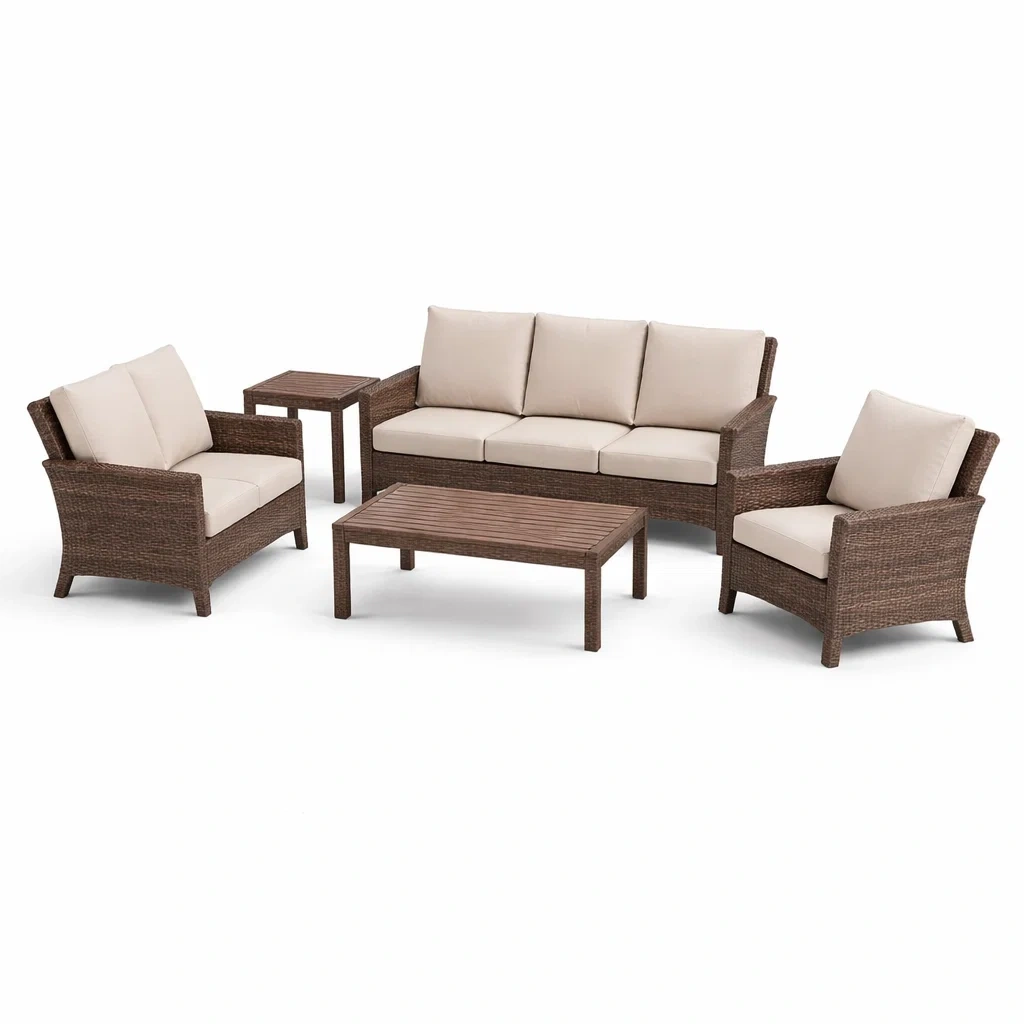 Set di divani da giardino in polyrattan marrone con cuscini crema 5 pezzi