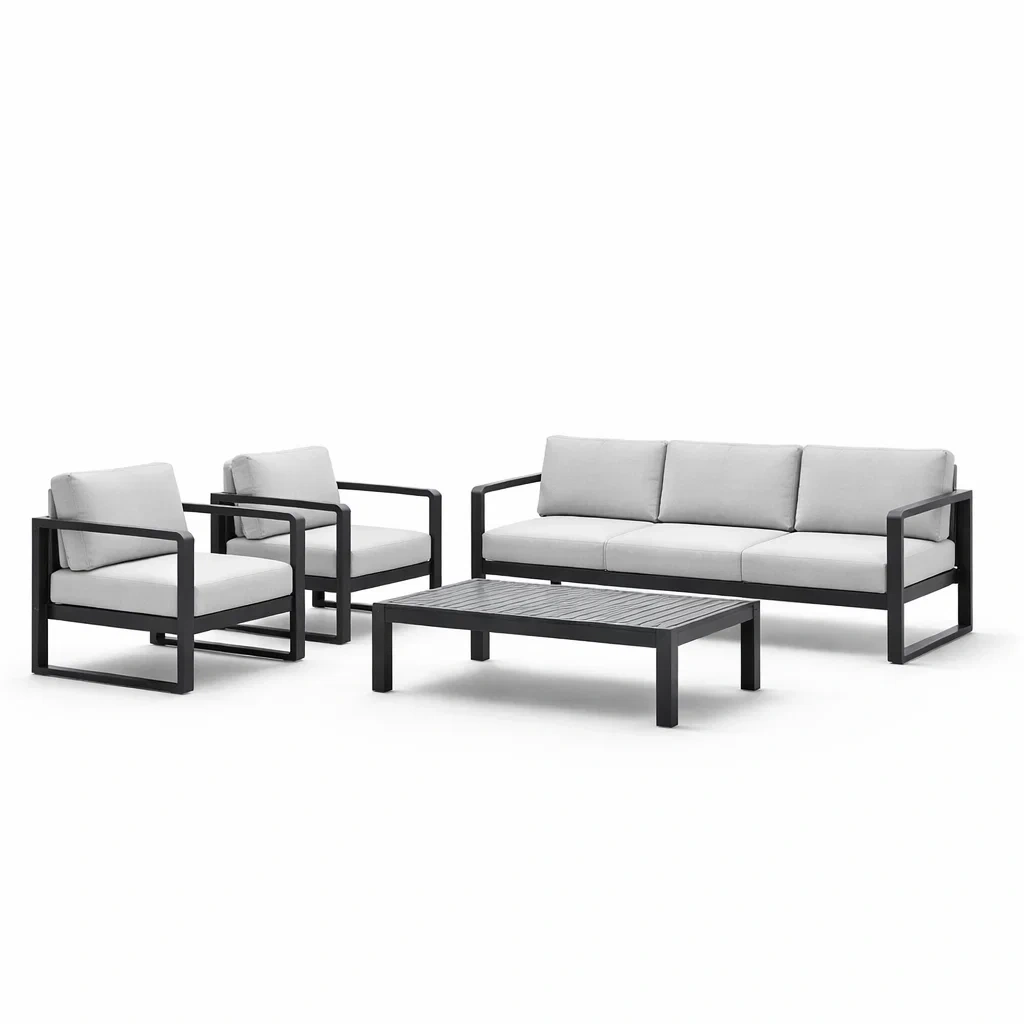 Set di divani da giardino in alluminio con cuscini in poliestere grigio e nero