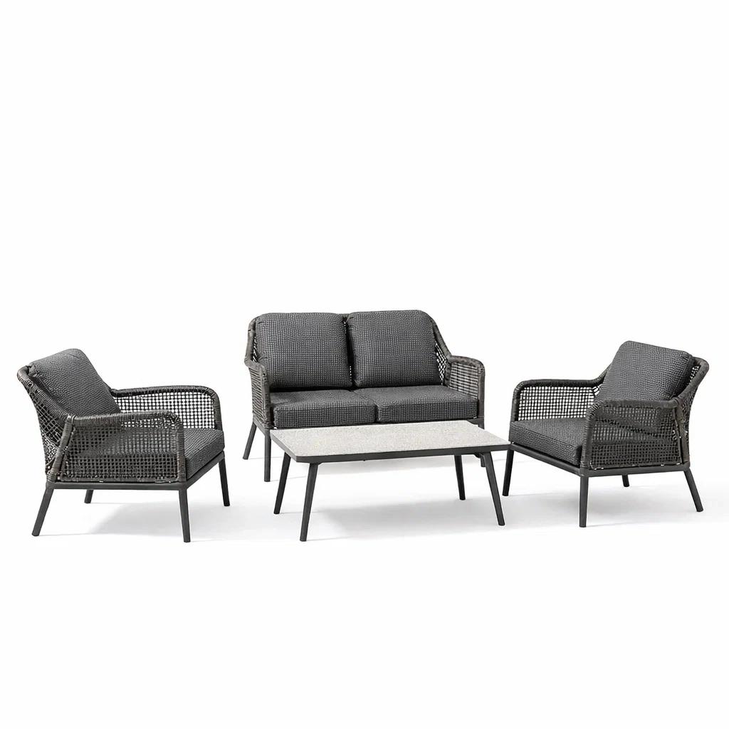 Set composto da: due poltrone, un divano a due posti e un tavolo da caffè.