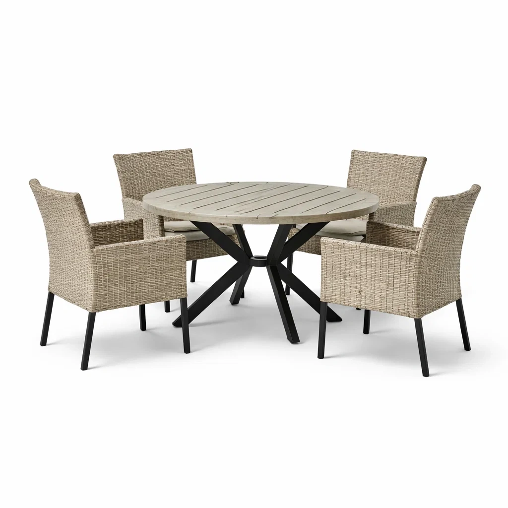 Set tavolo e sedie da esterno in legno e rattan sintetico con tavolo rotondo